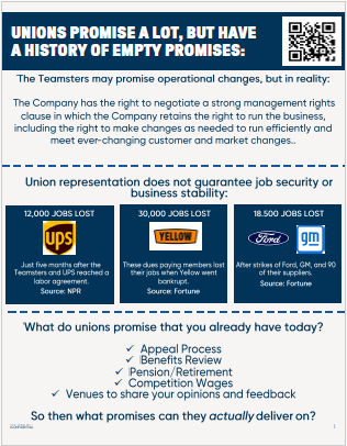The union wants you to vote for them so they can represent you for the purposes of collective bargaining. Before you make a decision, you should ask the union representative some questions. We hope that the union organizer would provide honest and accurate answers to your questions. The Company will continue to provide you with facts.